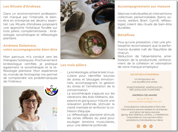 Dans un monde professionnel en perpétuel mouvement, le bien-être au travail n'est plus une option — c'est le socle sur lequel repose toute performance durable. Parce que chaque collaborateur est un être entier, corps et âme, Les Rituels d'Andreea propose aux entreprises parisiennes un accompagnement QVT unique, fondé sur trois thérapies complémentaires : la kinésiologie, la sonothérapie et la réflexologie plantaire.
